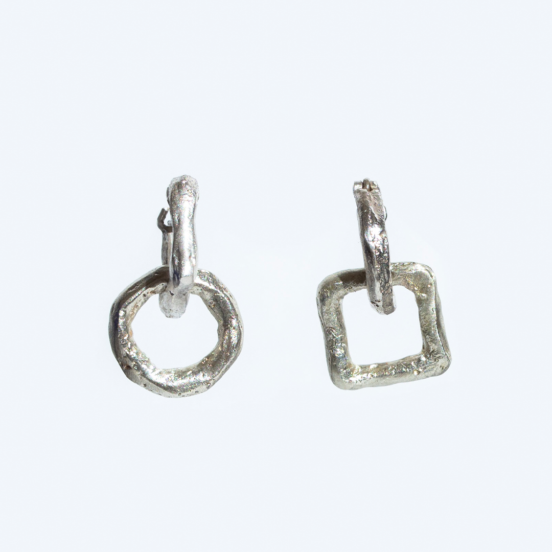 Organic earrings, odd in a subtle way. Designed for everyday wear, with the intention to travel through life with the wearer. Made using the traditional sand casting process, embracing imperfections. They can we worn multiple ways including without the second element, square on square, circle on circle, square on circle etc.