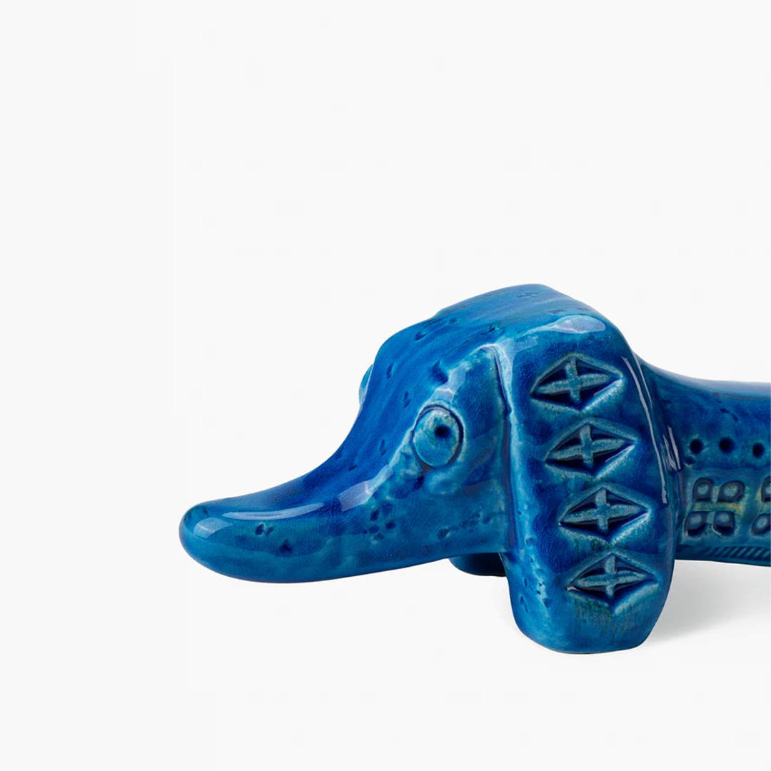This handcrafted ceramic dachshund features a low, elongated body with intricate hand-engraved motifs and a glossy blue crystalline glaze, bringing playful charm and artistic detail to any space.
