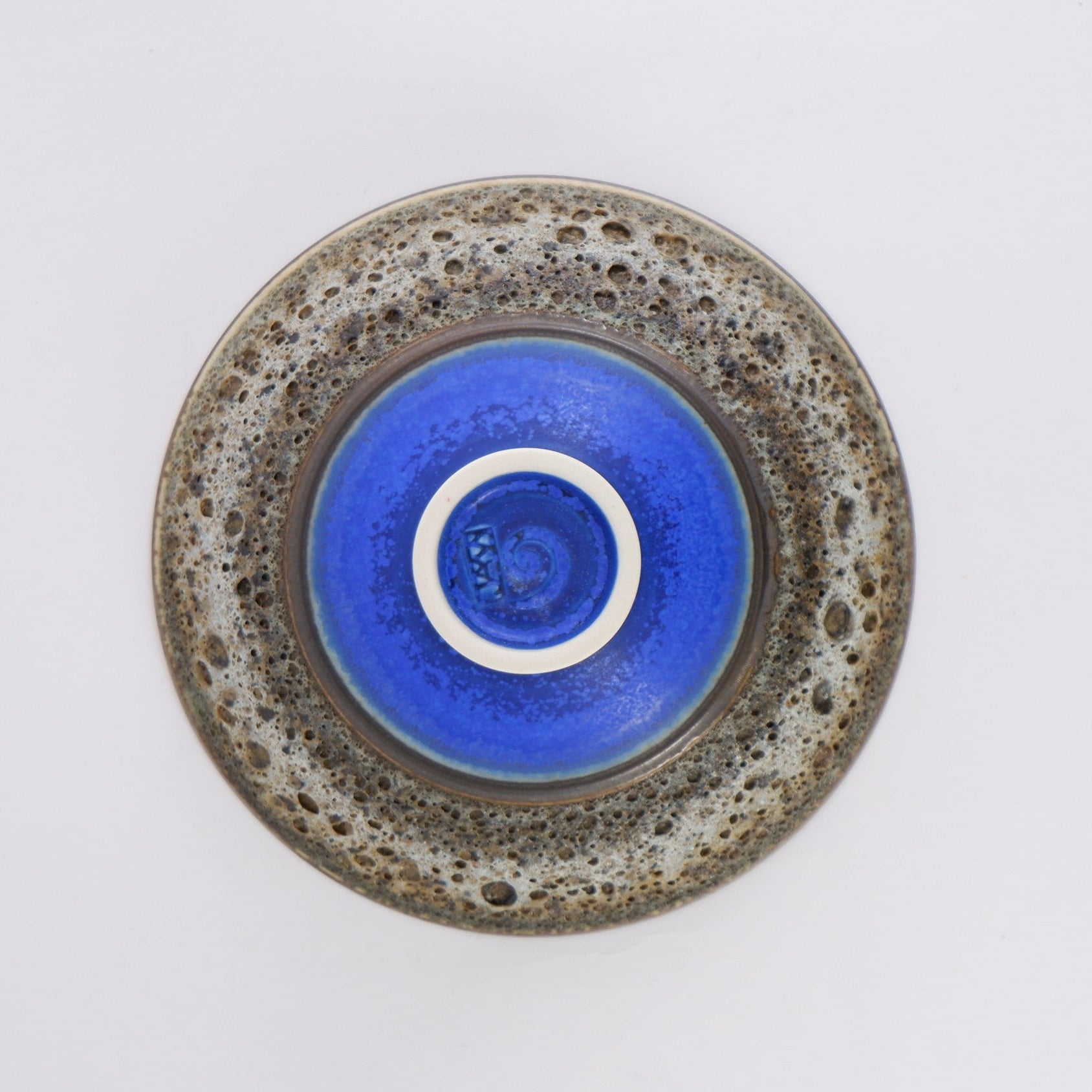 • Volcanic/lava glaze on exterior with layered blue glazes.