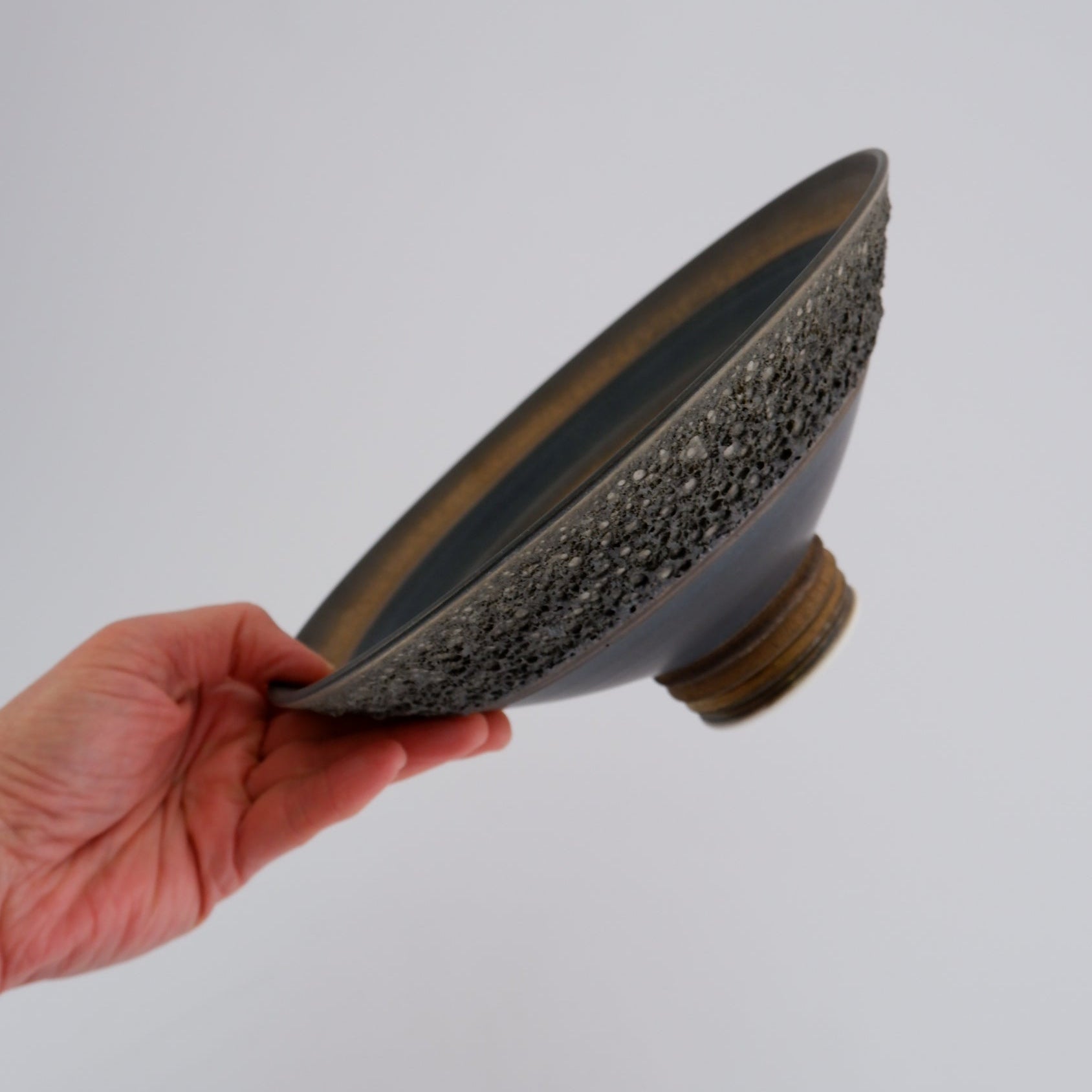 • Volcanic/lava glaze on exterior and gold bands in side.